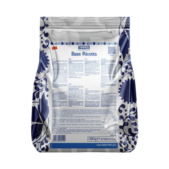 Base Ricotta Fabbri 1905 is a gelato base for making ricotta-flavored gelato. The partial use of fresh cream, replacing an equal part of milk, makes the gelato creamier and “warmer.” Contains 20% mixed dehydrated ricotta.